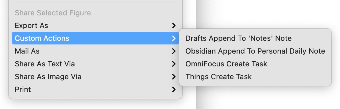 Curio supports an advanced option where you can configure custom sharing actions to send selected figures directly to other applications using their app URL schemes.